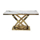Supporting the top is a bold geometric metal base finished in a rich gold tone. The intersecting design not only creates a dramatic architectural statement but also ensures excellent load-bearing strength and stability. The wide base foundation provides balance and wobble-free performance, making it suitable for everyday use in both homes and commercial environments.